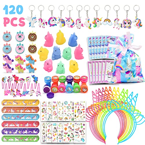 Moltby Festpåsar med enhörningstema, fyllning, nyckelringar, stämplar, armband, hårklämmor, enhörning, födelsedagsfest, gåvor, piñata för barn, 120 st