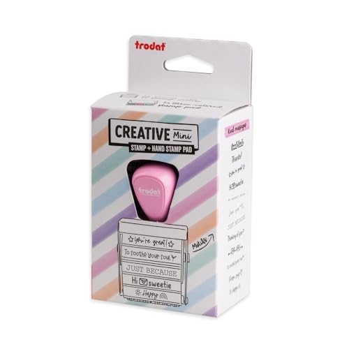 Trodat Creative Mini stämpelset barn meddelanden för kreativ design – 12 avtryck, engelska, kreativa stämplar i pastellrosa inkl. stämpelkudde i rosa, svart, grön, 30 x 5 mm