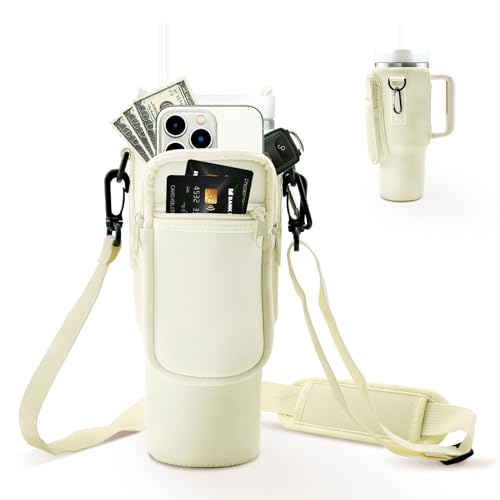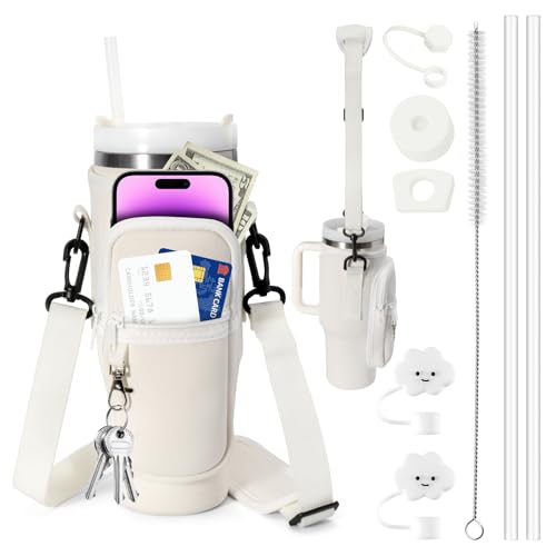 LUOJINYI Vattenflaskhållare väska för Stanley Tumbler, Stanley Cup-väska, Stanley Cup tillbehör med remmar och telefonväska, halmtillbehör och läckagesäkra tillbehör och karbinhakar (krämvit)