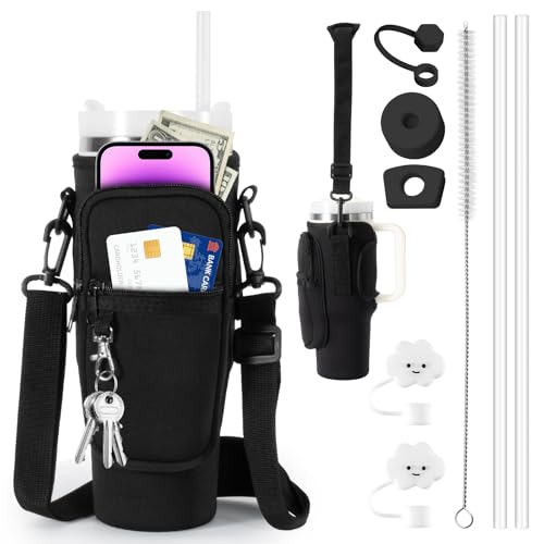 LUOJINYI Väska för vattenflaskhållare för Stanley Tumbler, Stanley Cup-väska, Stanley Cup tillbehör med remmar och telefonväska, halmtillbehör och läckagesäkra tillbehör och karbinhakar (svart)