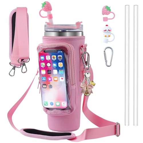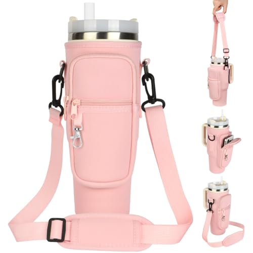 AYESY Vattenflaska bärväska, vattenflaskhållare med justerbar rem och telefonficka kompatibel med Stanley Cup, passar Stanley Quencher 1,25 dl dricksglas, promenader vandring camping rosa