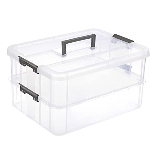 IGNPION 2-nivåers stapelbar förvaringsbox plast justerbara förvaringsbehållare med bärhandtag genomskinliga behållare organiserare för konst och hantverk leksaker, sytillbehör, mörkgrå