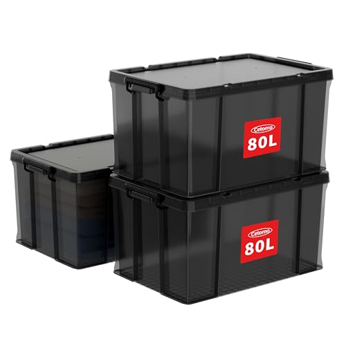 Cetomo 80 L x 3 förvaringslådor, stapelbar förvaringslåda med lock, kraftig behållare med lock med förstärkta hörn, vertikala sidor och klämstängning, hållbar, plast, klar svart, 80 L-3-pack