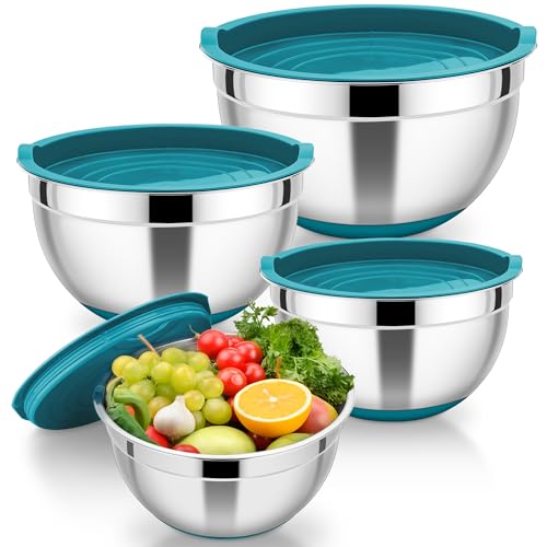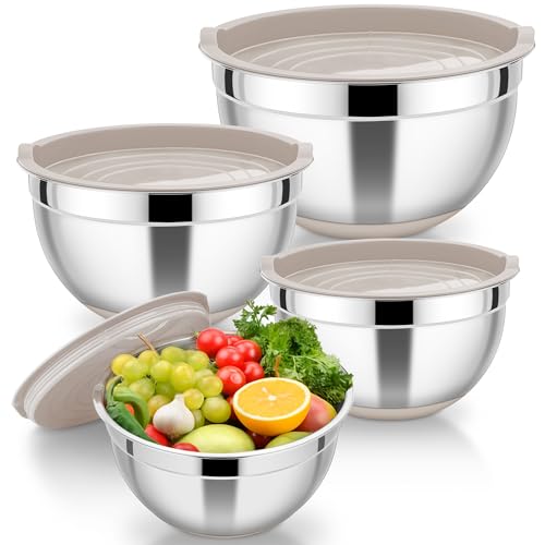 HaWare blandningsskål set om 4, rostfritt stål skål salladsskål med lufttätt lock och silikonbotten, perfekt för matlagning bakning förvaring, stapelbar & diskmaskinssäker, 4,6 l/2,8 l/1,5 l/0,7 l –