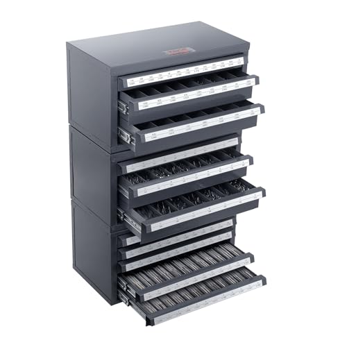 VEVOR 3 delar tre bokstäver, fem-lådors organiserare för trådmätningsstorlekar, stapelbar för förvaring av borrkronor, Q235, grå med orange textur, (1/16 tum till 1/2 tum) +(A till Z)+(#1 till #60)