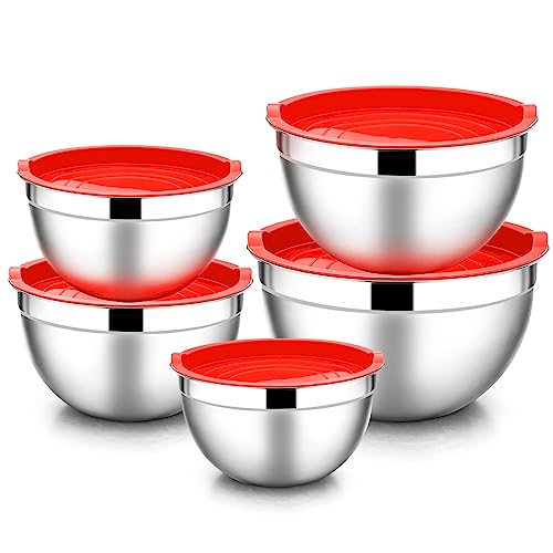 HaWare Salladsskål med lock, blandningsskål i rostfritt stål, uppsättning om 5–4,5 L/2,7 L/1,5 L/1,2 L/0,7 L, perfekt för matlagning/bakning/förvaring, stapelbar och diskmaskinssäker – röd