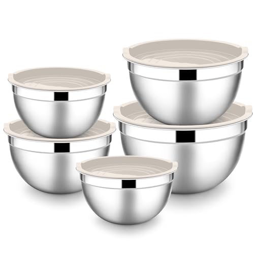 HaWare blandningsskål set om 5, salladsskål i rostfritt stål, skål med lufttätt lock – 4,5 l/2,7 l/1,5 l/1,2 l/0,7 l, perfekt för matlagning/bakning/förvaring, stapelbar & diskmaskinssäker – khaki