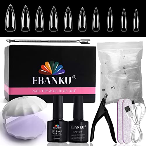 EBANKU Konstgjorda Nagelspetsar Och Limgelset, 6 i 1 Extra Starkt Nagellim Och 500 ST Galska Naglar med Mini Nagellampa, Nagelfilar, Nagelklippare, Nagelförlängningssats för DIY Nail Art