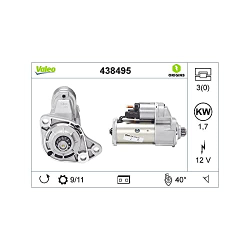 VALEO 438495 Startmotor Märkeffekt: 1,7 kW stopp och start: NO Antal tänder: 11 tänder Spänning: 12 V Rotationsriktning: ANTI CLOCKWISE