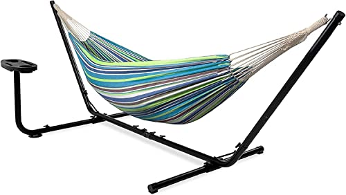 VITA5 Hängmatta med ram och bord – hängmatta utomhus för trädgården, poolen och balkongen – generösa hängmattor 2 personer – dubbel hängmatta med stativ och sidobord – 200 kg lastkapacitet