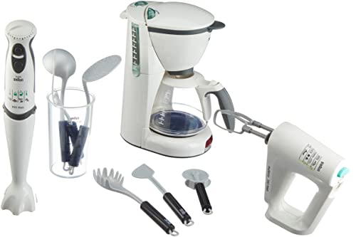 Theo Klein 9625 Braun kombinationsset I Värdefull leksaksköksutrustning: batteridriven kaffekokare, stavmixer och stavmixer inklusive tillbehör I Leksaker för barn från 3 år och äldre