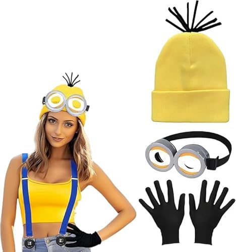 VIDSTW 3 stycken Minion Kostym Tillbehör Steampunk Glasögon Gul Hatt Svarta Handskar Halloween Accessoarer Vuxna Barn Vuxna Tecknade Kostymer för Jul Halloween
