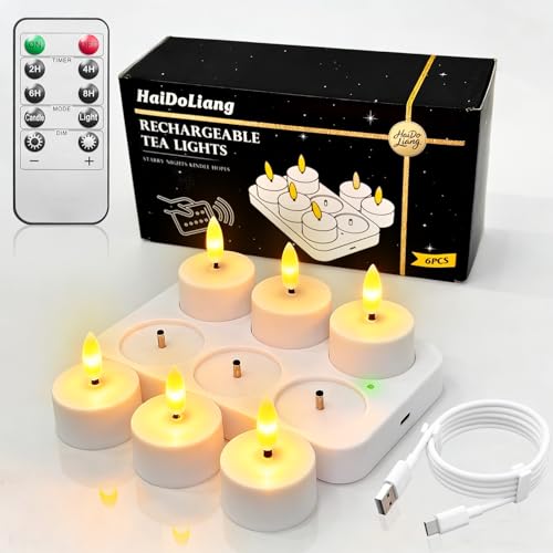 HyDlan 6 st uppladdningsbara värmeljus med timerfunktion och laddningsstation, LED uppladdningsbara stearinljus flimrande med fjärrkontroll, timer för rum, alla hjärtans dag, halloween, jul, bord