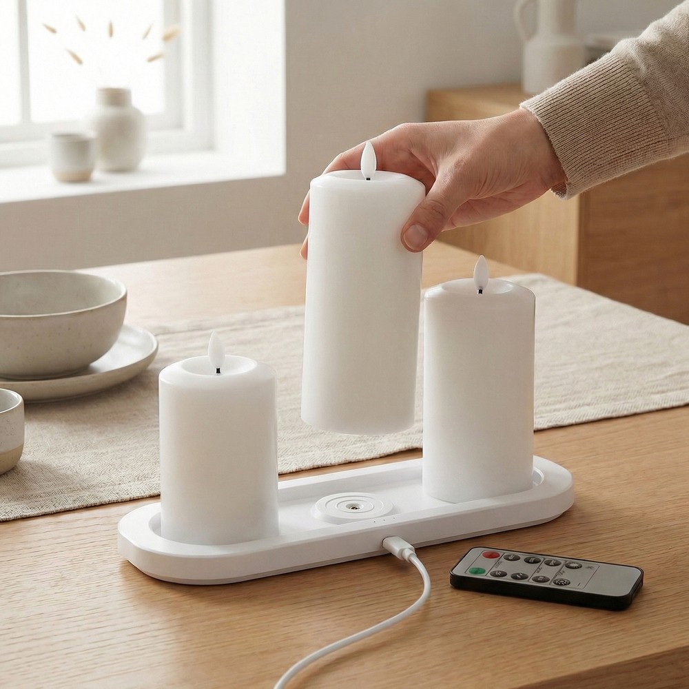 4-pack vita LED-stearinljus inkl. laddningsbas - Ø2cm, Höjd: 25cm, antikljus, inkl. fjärrkontroll, timer