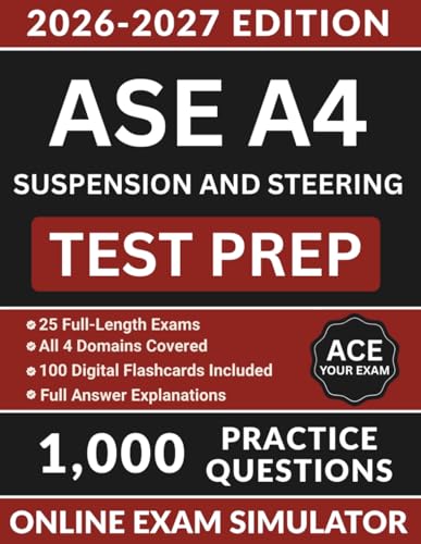 ASE A4 Suspension and Steering Test Prep: Automotive Service Excellence Study Guide with 1,000 Practice Questions, Wheel Alignment, Ball Joints, & Full Answer Explanations