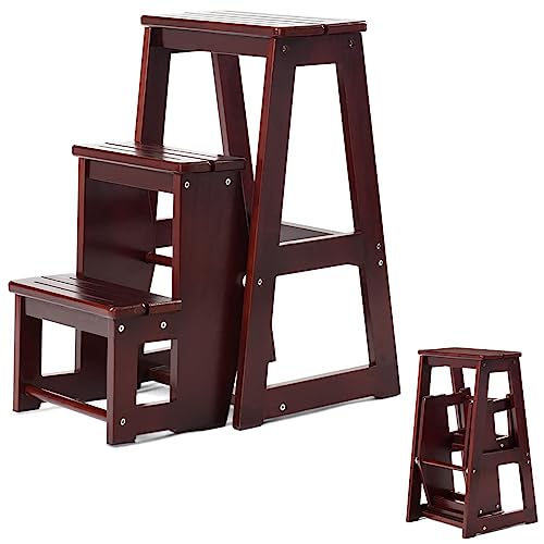 GIANTEX Köksstege/pall, av trä, 3 steg, trappstege, hopfällbar, i furu (kaffefärg)