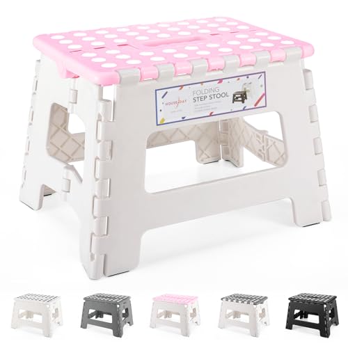 HOUSE DAY Hopfällbar stegpall 23 cm, robust hopfällbar pall med bärhandtag, hopfällbar steg med halkfri yta för barn och vuxna, bärbar design för kök, badrum, camping rosa och grå