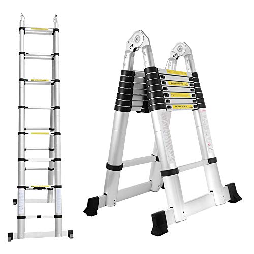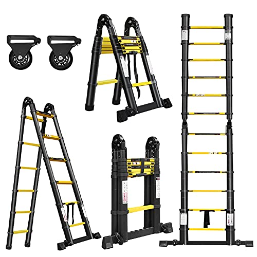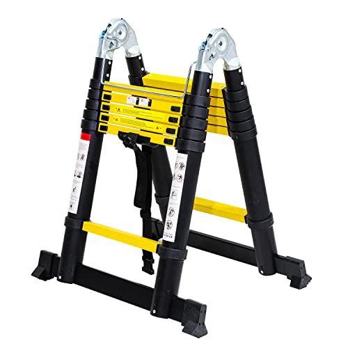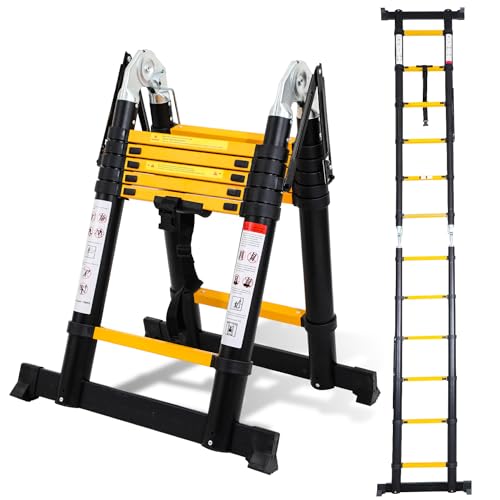 Cecaylie Hopfällbar teleskopstege i aluminium, 3,8 meter (1,9 + 1,9 m) utdragbar stege, halkfri aluminiumstege, trappstege, multifunktionsstege, utdragbar stege med 150 kg lastkapacitet, svart gul