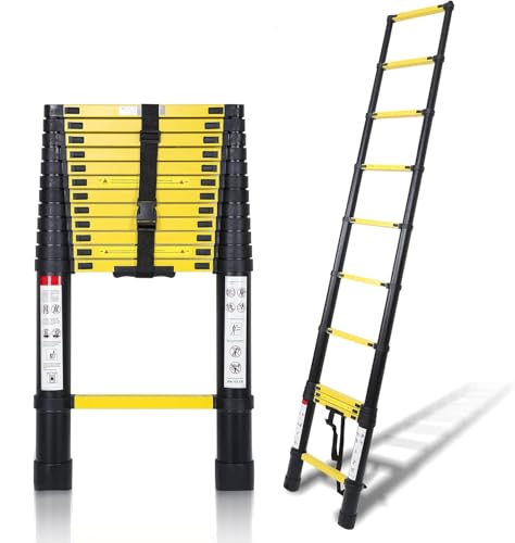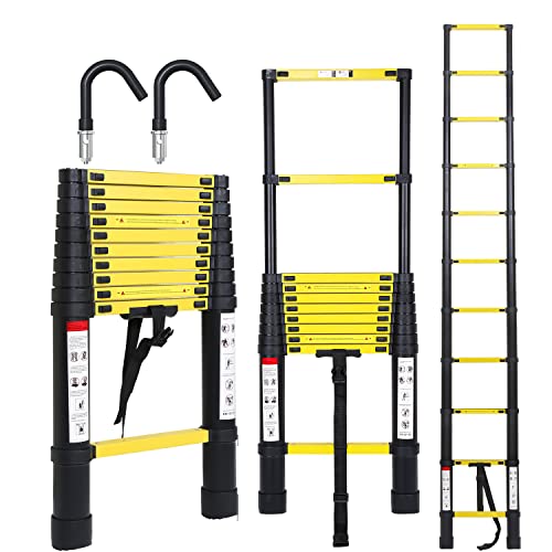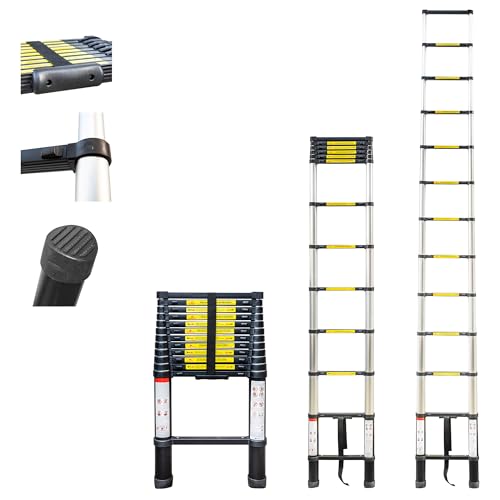 Ikodm Teleskopstege i aluminium med avtagbar krok, 3,2 m utdragbar stege, halkfri aluminiumstege stående stege multifunktionsstege, utdragbar stege, belastning 150 kg, svart gul