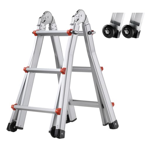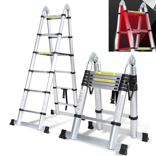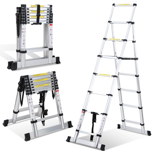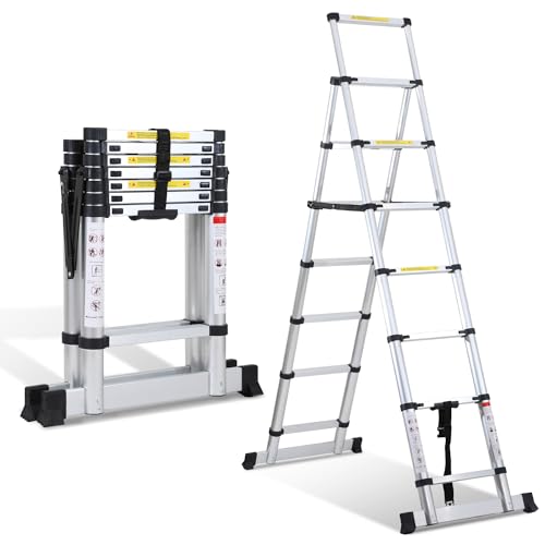 Fiqops 2,0 m + 2,3 m teleskopstege 6 + 7 steg, vikbar stege, A-ram, max belastning 150 kg/330 pund, aluminiumutdragbar stege för takreparationer, hopvikt storlek 69 cm