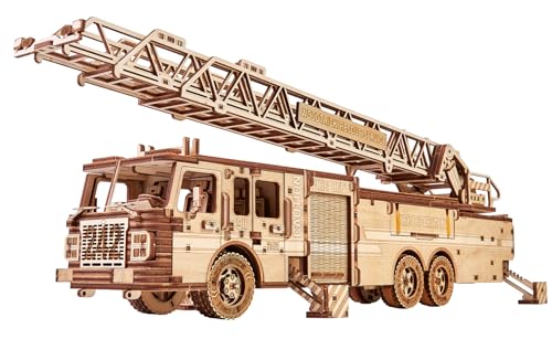 Trick Rescue Firetruck flyttbar – roterande utdragbar stege – 3D-träpussel för vuxna och barn att bygga – rider upp till 6 m – trämodeller ingenjörskonst gör-det-själv projektmekaniskt modellkit