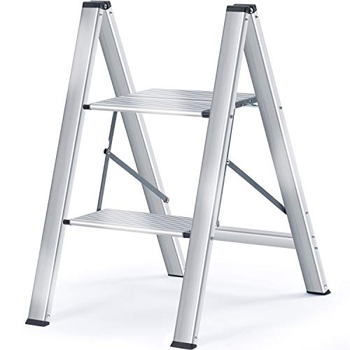 KINGRACK Trappstege med 2 steg, vikbar stege i aluminium, bärbar smal köksstege, säker hushållsstege, trappstege med multifunktion, silver