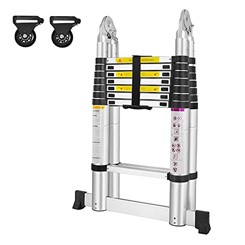 Cecaylie 5 m (2,5 + 2,5) teleskopstege, hopfällbar stege aluminium med avtagbara dubbla remhjul, maximal belastning 150 kg/330 pund, utdragbar stege, halkfri, silver