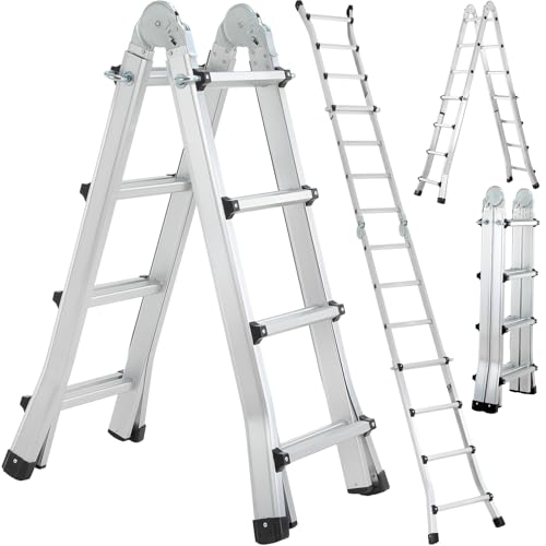 UISEBRT multifunktionsstege 4 x 4 aluminium med plattform, 6-i-1 multifunktionsstege, 470 cm, hopfällbar stege, aluminiumstege, kombistege, multifunktionsstege upp till 150 kg, silver