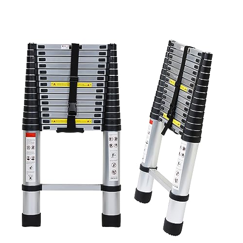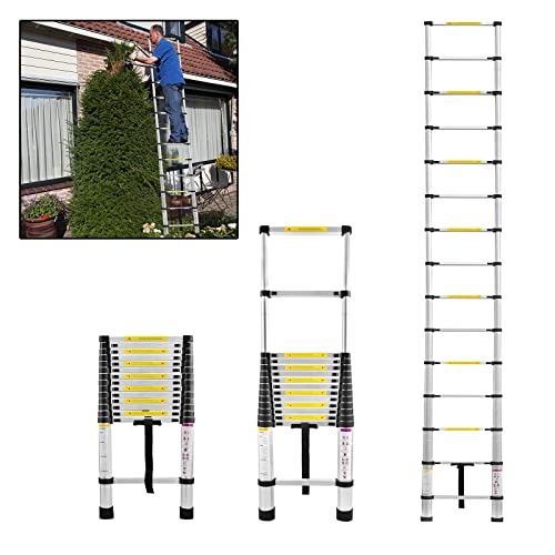 Lospitch 3,8 m teleskopstege i aluminium, hopfällbar, utdragbar stege, multifunktionsstege med fjäderbelastad låsmekanism, 150 kg maxvikt för hemarbeten, vind, trädgård