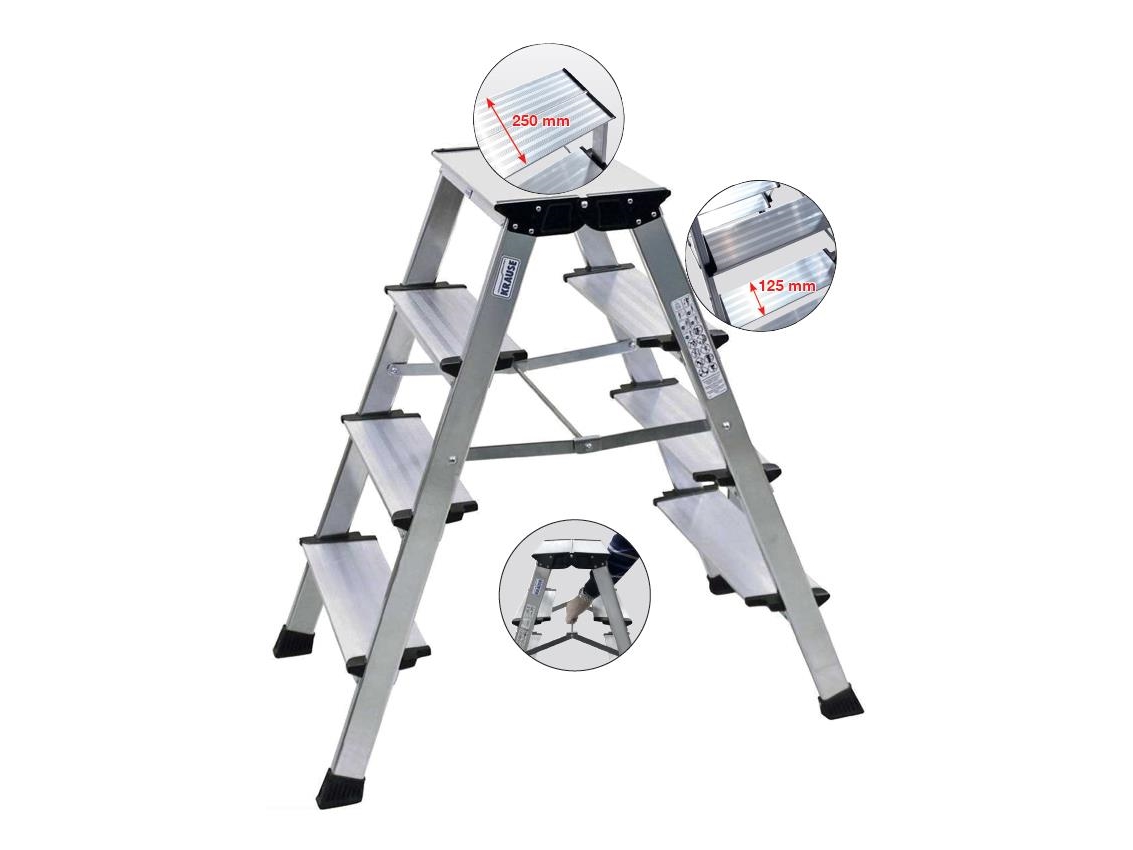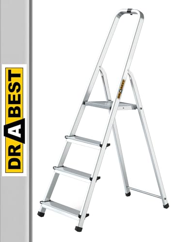 Drabest Hemma aluminium 4-stegs stege – Robust konstruktion, säker design, 125 kg kapacitet – Robust konstruktion – Anti-halk fötter – 60 cm ledstång – 0,43 x 1,45 x 0,75 m