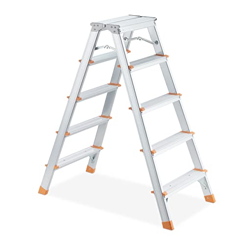 Relaxdays Stegstege, aluminium, hopfällbar, 5 steg, stege upp till 150 kg, kan gå på båda sidor, stående stege, silver/orange