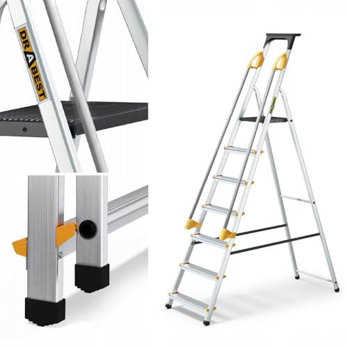 DRABEST Ladder PRO Series Aluminium Trappstege 7 Steg Stege Fällbar med säkerhetsräcken Trappstege Lastbar upp till 150 kg