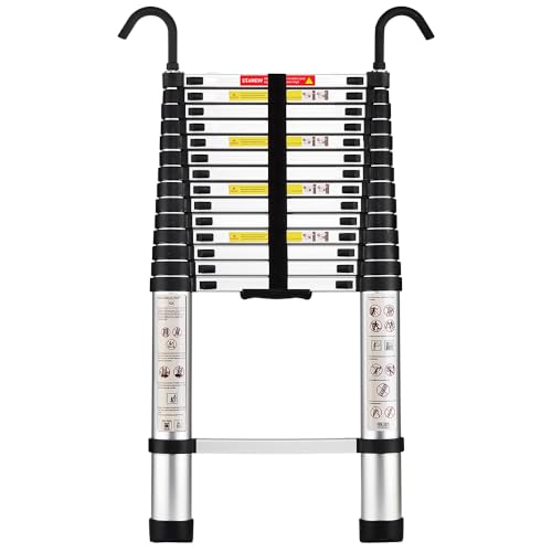 LZQ Teleskopstege med krok, 4,4 m utdragbar stege i aluminium, multifunktionsstege, 150 kg lastkapacitet, utdragbar stege med avtagbar krok halkfri