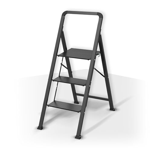 KINGRACK Stegstege, stegstege 3 steg, hopfällbar stege med ledstång, halkfri hushållsstege med vikskydd, aluminiumstegpall, lastbar upp till 150 kg, svart