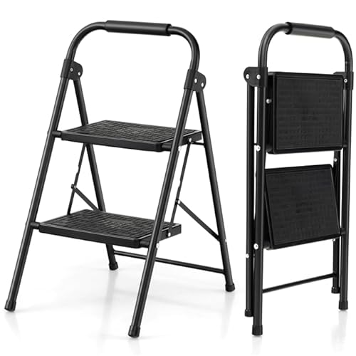 Lars360 Hopfällbar stege med 2 steg i stål, halkfri gummiyta, bredare steg, lastkapacitet upp till 250 kg, för hem, kontor, garage, svart