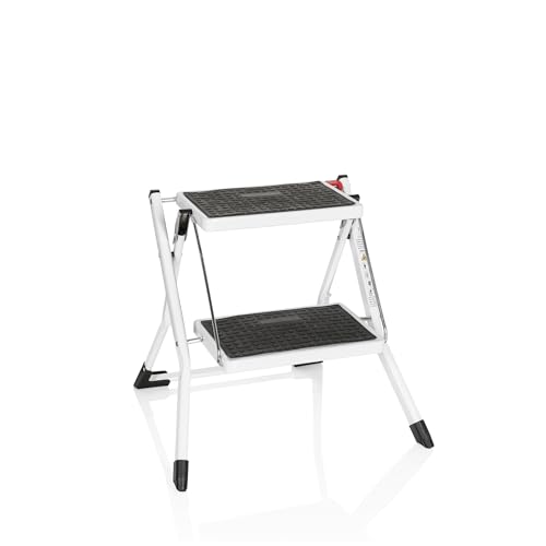 hjh OFFICE Hopfällbar stege 2 steg SOLID W1 Stål stegpall hushållsstege lätt halkfri trappstege bärbar, kapacitet upp till 150 kg, Vit