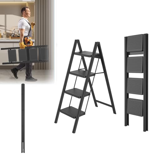 Lars360 4-stegs hopfällbar stege i stål, halkfri gummiyta, bredare steg, lastkapacitet upp till 250 kg, för hem, kontor, garage, svart