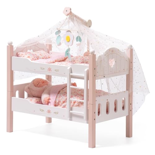 ROBOTIME Dockvåningssäng av trä, docksängar, ombyggbar säng med stege och sängkläder, för 45 cm stora stapelbara docksängar, perfekt docktillbehör, gåva till barn (rosa)