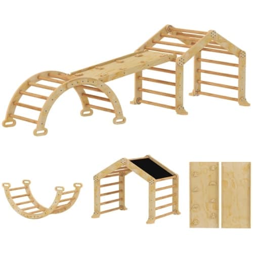 HOMCOM 5-i-1 klätterset med gunga, horisontell stege, klättringsnät, klättervägg, klätterleksaker för barn, 120 x 105 x 120 cm, naturligt trä