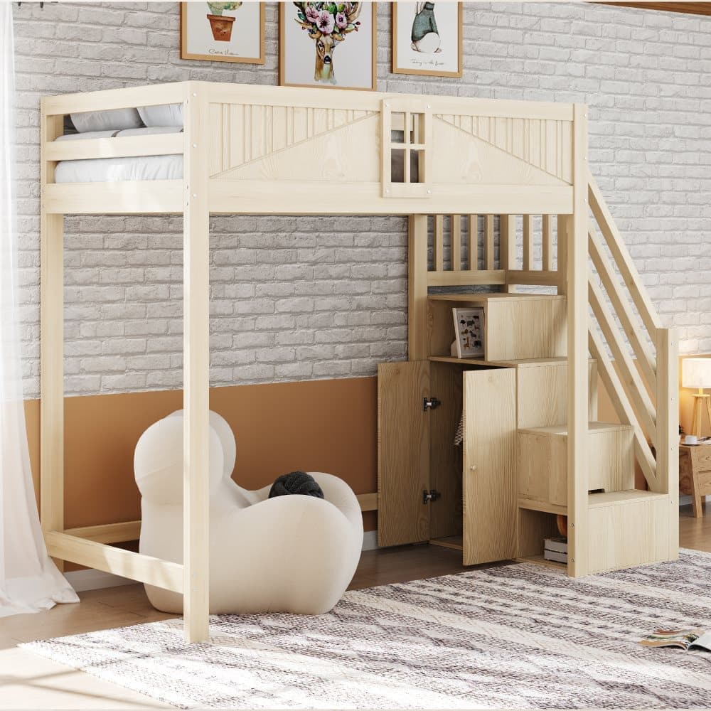 Högsäng i massivt trä 90×200 cm, med säkerhetsdörr och fönster, stege och sidoförvaring, träfärg