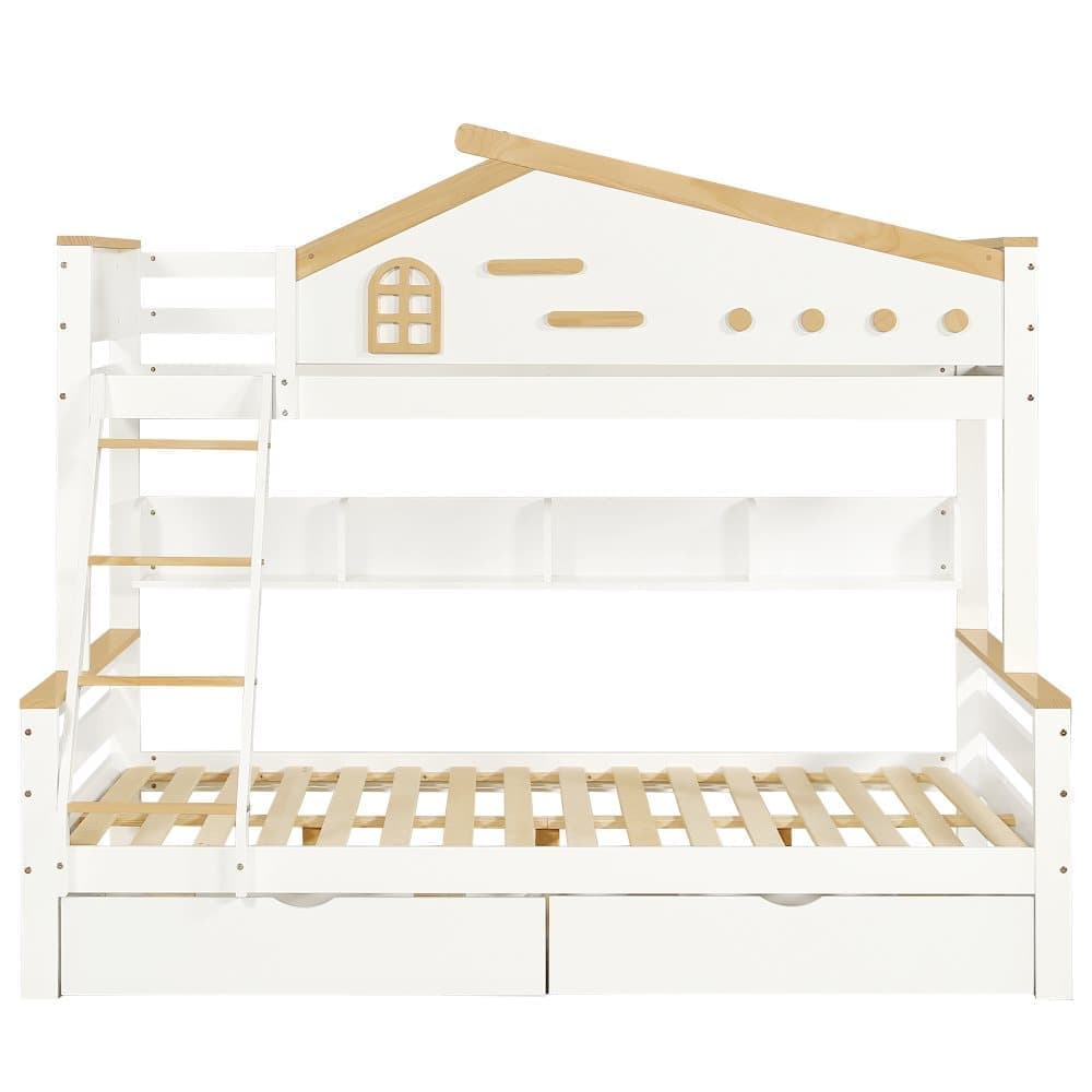 Våningssäng i trä 90 x 200 cm + 140 x 200 cm - med stege och 2 lådor - vit och natur