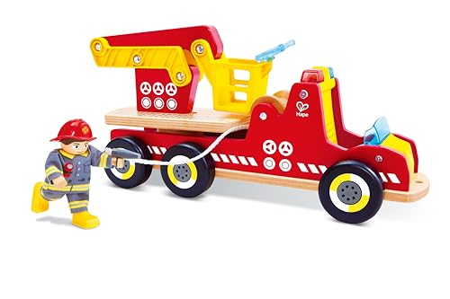 Hape Brandbil med belysning och sirene, med brandmansfigur – leksaksbil – brandbil med roterande stege och tillbehör – av trä, rullleksak för barn från 2 år