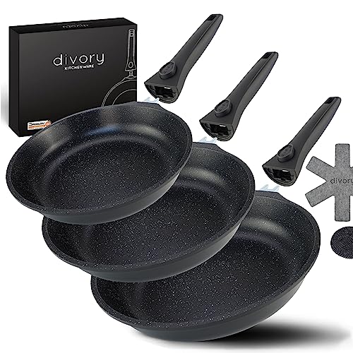 DIVORY 3-delad stekpanna set 20cm, 24cm, 28cm med avtagbart handtag, induktion, non-stick belagd, non-stick stekpanna hög + pannskydd