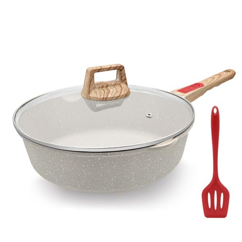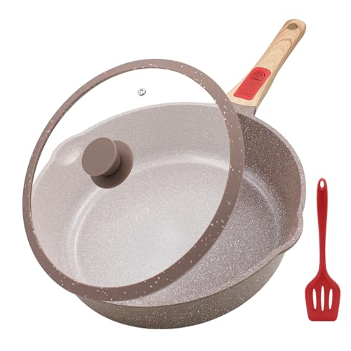 AIKENBBKK Non-stick keramisk stekpanna med lock, 28,9 cm non-stick djup stekpanna med avtagbart handtag, kök matlagningsgryta, ugnssäker (brun)