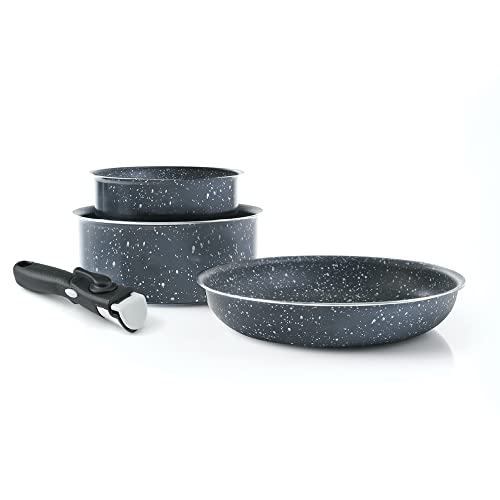 Qulinart by Brandt - 4 stycken induktionsköksredskap - set med 2 kastruller 16 och 20 cm non-stick, 1 stekpanna 24 cm och avtagbart handtag - aluminium - all eld - marmorgrå