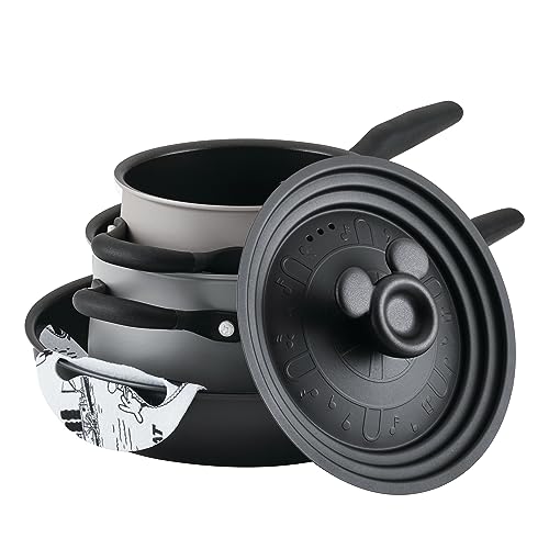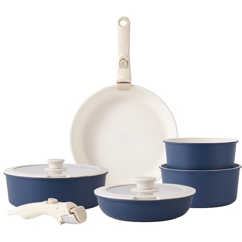 RIOVARM Induktion kastruller och stekpannor set med avtagbara handtag, non-stick granit, stapelbara köksredskap set med silikonlock, platsbesparande kastrull- och stekpannor utan PFOA, stekpanna,