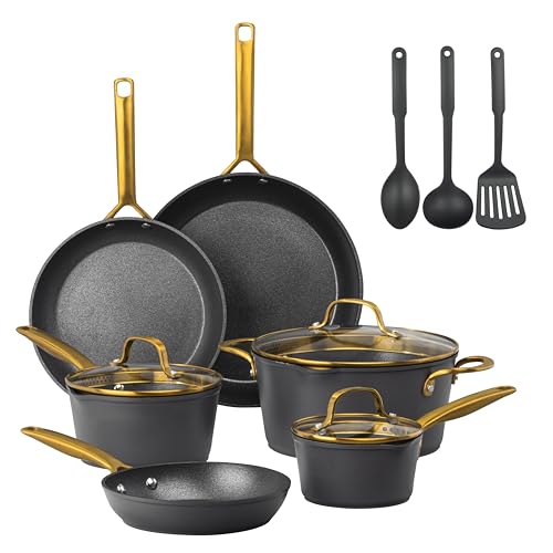 RIOVARM Induktion kastruller och stekpannor set med lock, keramisk non-stick beläggning köksredskap set, köksredskap väsentliga set med köksredskapsset, stekpanna, kastrull, sauteus, såspanna spatel