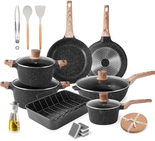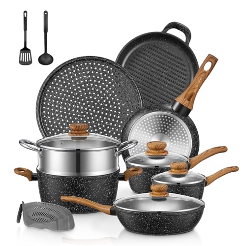 RIOVARM Induktion kastruller och stekpannor set med lock granit non-stick beläggning köksredskap set med grillpanna kök Essentials set stekpanna kastrull sautös såspanna spatel