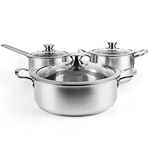 Tieplis kastruller och stekpannor, set i 6 delar i rostfritt stål, med glaslock i rostfritt stål, handtag som håller sig svalt, induktionssäker, diskmaskin, julklappar, silver