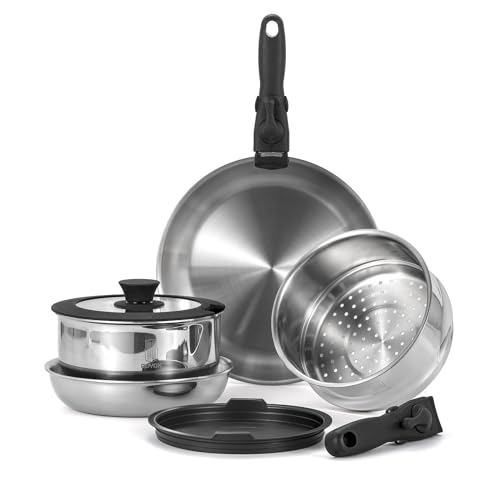 ROYDX 18/10 rostfritt stål kastruller och stekpannor set med ångkokare och avtagbart handtag, 10 delar stapelbar induktionshäll, stekpannor med kastrull för alla spisar ugnssäker, för singel och